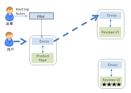 此时系统中部署了V1和V2两个版本的reviews服务,但所有的业务流量都被规则reviews-default导向了V1,如下图所示: