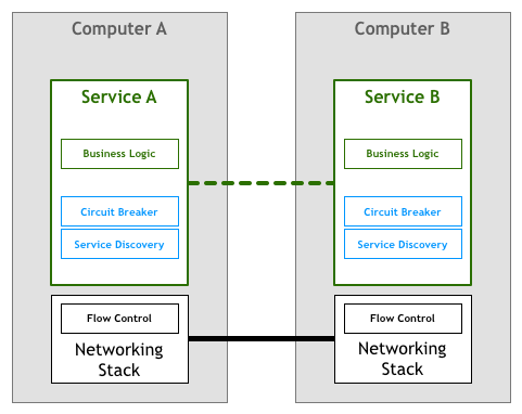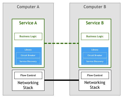 在一个分布式系统中,这部分逻辑比较复杂,为了为微服务应用提供一个稳定、可靠的基础设施层,避免大家重复造轮子,并减少犯错的可能,一般会通过对这部分负责服务通讯的逻辑进行抽象和归纳,形成一个代码库供各个微服务应用程序使用,如下图所示: