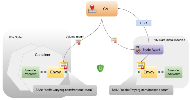 - 当Pod创建时,Kubernetes根据该Pod关联的Service Account将密钥和证书以Kubernetes Secrets资源的方式加载为Pod的Volume,以供Envoy使用。