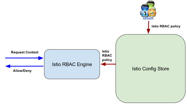 Istio RBAC Engine目前被实现为一个Mixer Adapter,因此其可以从Mixer传递过来的上下文中获取到访问请求者的身份(Subject)和操作请求(Action),并通过Mixer对访问请求进行策略控制,允许或者禁止某一次请求。