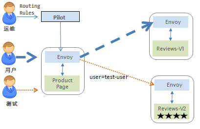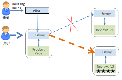 Pilot还定义了一套DSL(Domain Specific Language)语言,DSL语言提供了面向业务的高层抽象,可以被运维人员理解和使用。运维人员使用该DSL定义流量规则并下发到Pilot,这些规则被Pilot翻译成数据面的配置,再通过标准API分发到Envoy实例,可以在运行期对微服务的流量进行控制和调整。