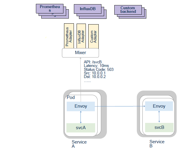 首先,Sidecar会从每一次请求中收集相关信息,如请求的路径,时间,源IP,目地服务,tracing头,日志等,并请这些属性上报给Mixer。Mixer和后端服务之间是通过适配器进行连接的,Mixer将Sidecar上报的内容通过适配器发送给后端服务。
