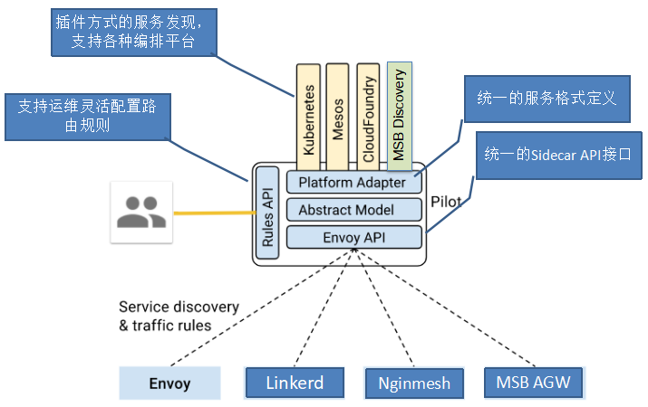 Pilot维护了网格中的服务的标准模型,这个标准模型是独立于各种底层平台的。Pilot通过适配器和各底层平台对接,以填充此标准模型。