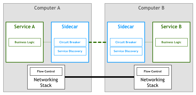 应用间的所有流量都需要经过代理,由于代理以sidecar方式和应用部署在同一台主机上,应用和代理之间的通讯可以被认为是可靠的。由代理来负责找到目的服务并负责通讯的可靠性和安全等问题。