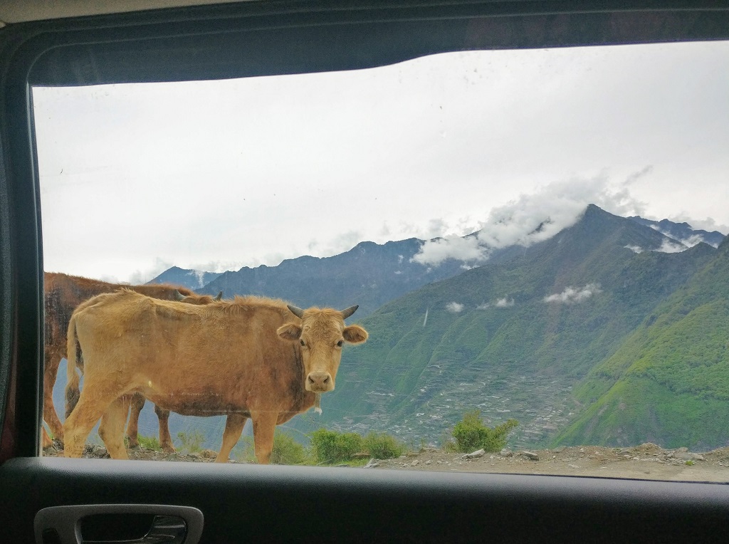 看到几头牛在路边吃草,看这淡定的眼神!山路边还时不时冒出一群小黑猪,目测就是一只就十多斤重,想给它们拍张照片,飞快地钻进灌木丛里面了,只好作罢。川西山里和草原上这种猪都是这样像牛羊一样放养的。我们流着口水说这个是资格的跑山猪,味道肯定巴适!