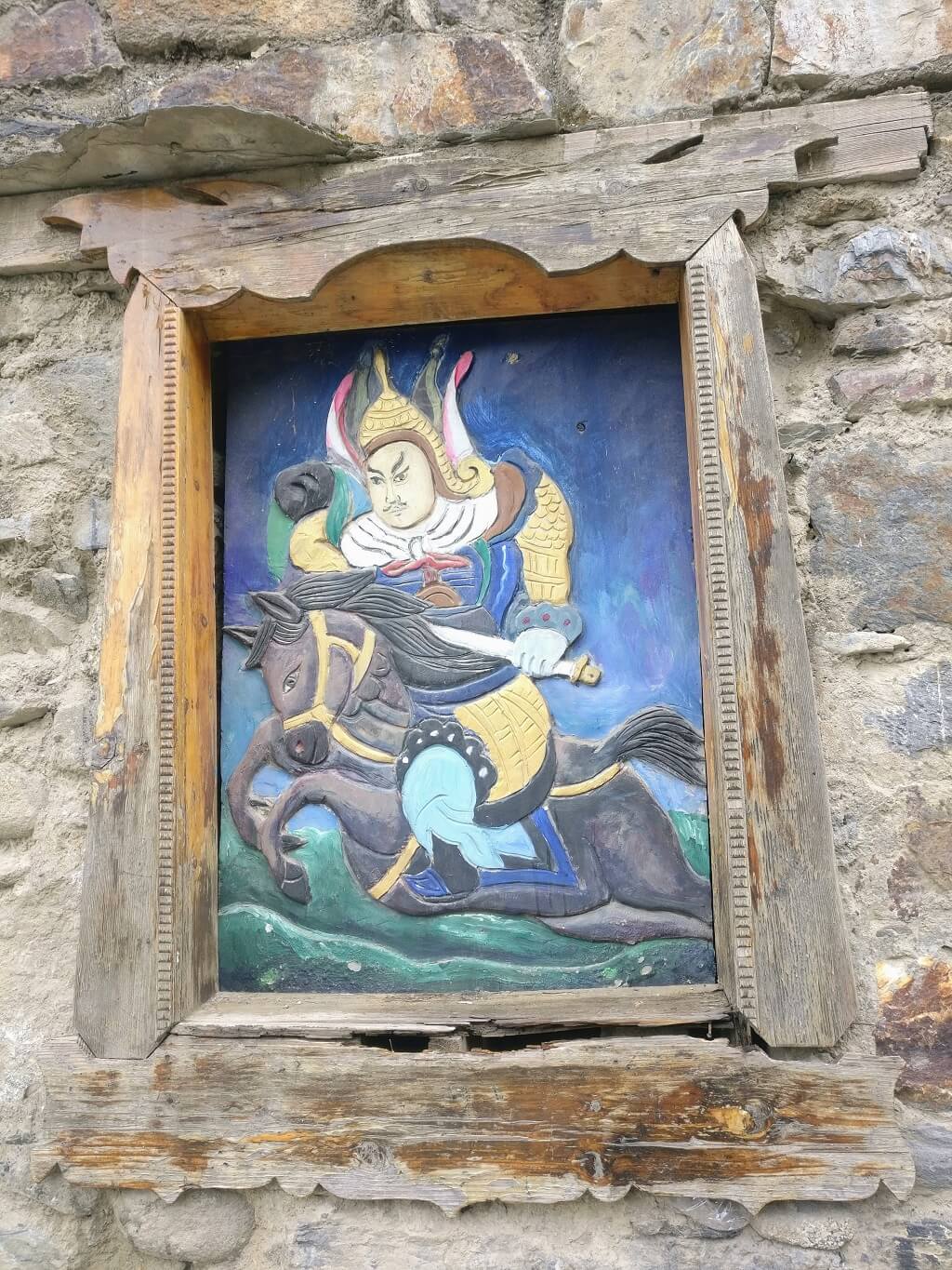 寨子墙上的石板画,画的是藏族传说中的英雄人物格萨尔王。