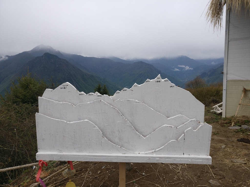 山顶搭建了一个台子和一个草房。大爷说这是举行节日的时候的临时厨房。每年有三个时间山顶的草坝上会举行锅庄舞会。这个木板上标注了山顶上望过去的几座雪山,可以看到最高的大黄峰有将近6000米高。