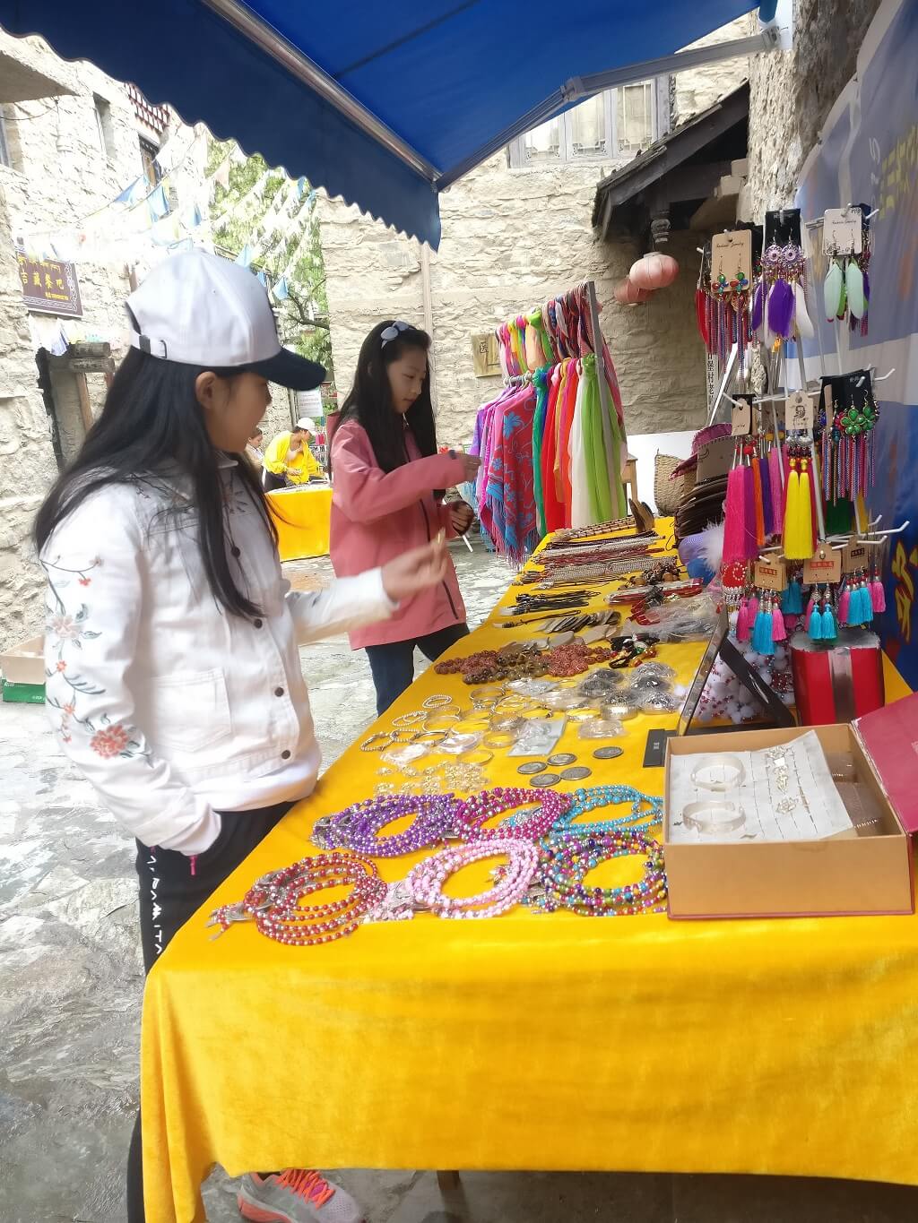 两个小朋友在小摊上找自己喜欢的小饰品,摊主是一个十八九岁的小姑娘,她平时在成都读书,放假回来摆个小摊勤工俭学。最后照顾她生意,给每个小朋友买了一个十多块钱的小玩意。