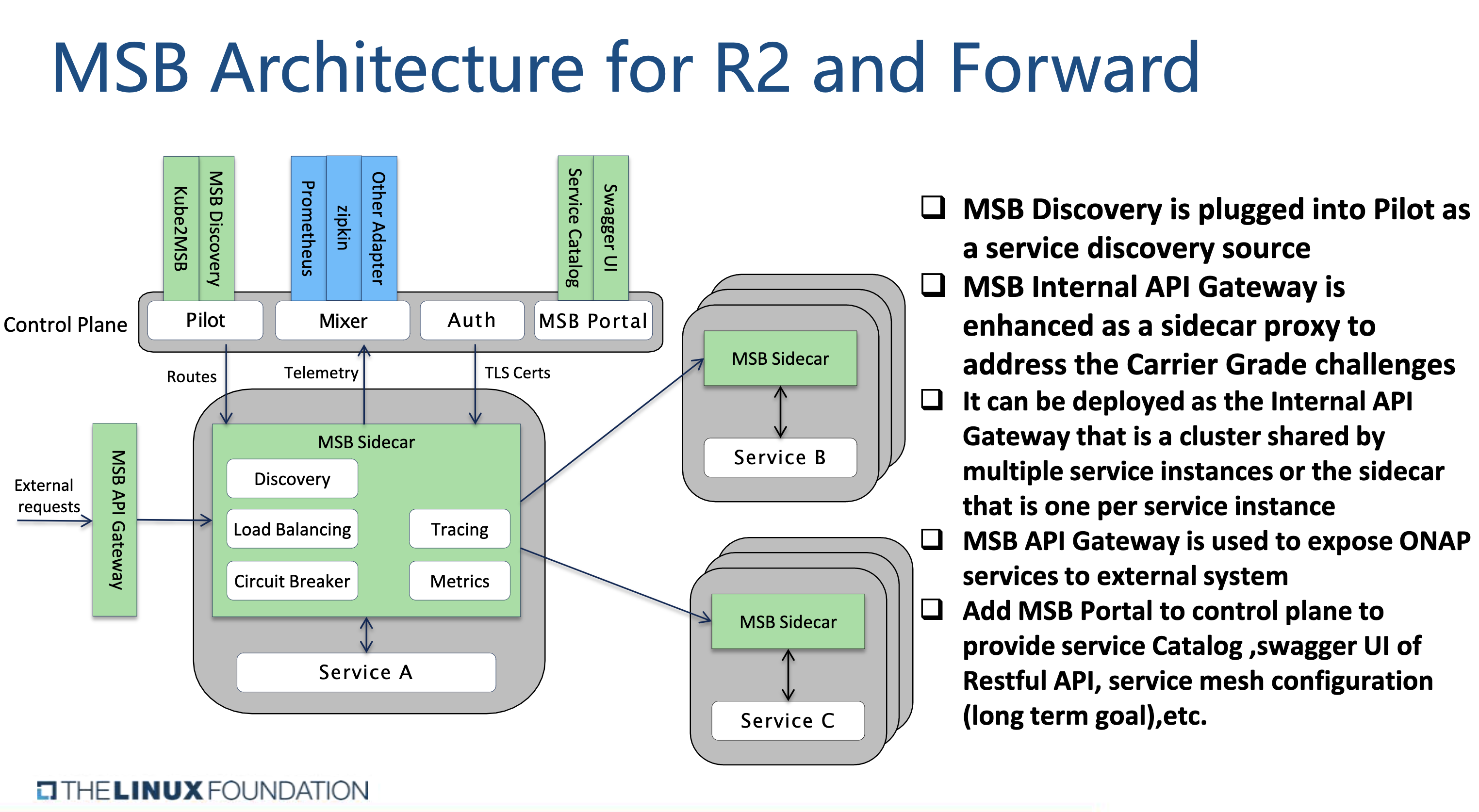 MSB Plan for R2 and Beyond: * Stability and Reliability: Reliable communication with retries and circuit breaker * Security: Secured communication with TLS * Performance: Latency aware load balancing with warm cache * Observability: Metrics measurement and distributed tracing without instrumentingapplication * Manageability: Routing rule and rate limiting enforcement * Testability: Fault injection to test resilienceof ONAP