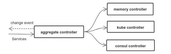 备注:上图中的controller实际上是Service Registry,aggregate controller和具体的各个类型的controller同时实现了Registry要求的controller和discovery interface。