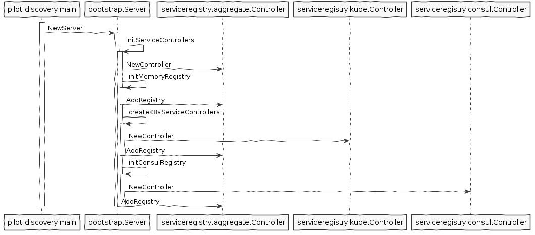 在pilot/pkg/bootstrap/server.go中,初始化了各种Service Registry,其流程如下图所示: