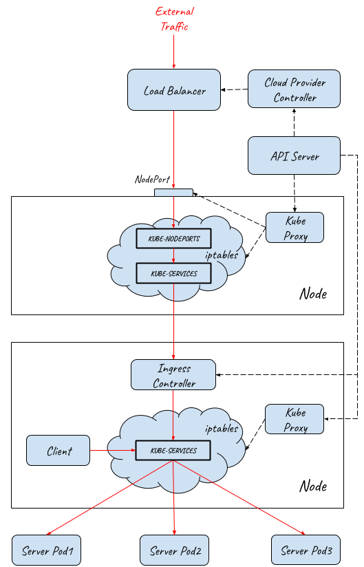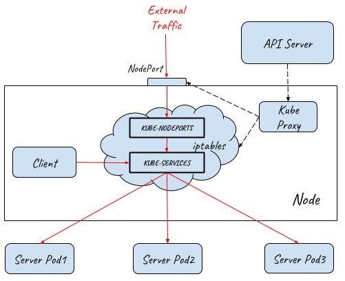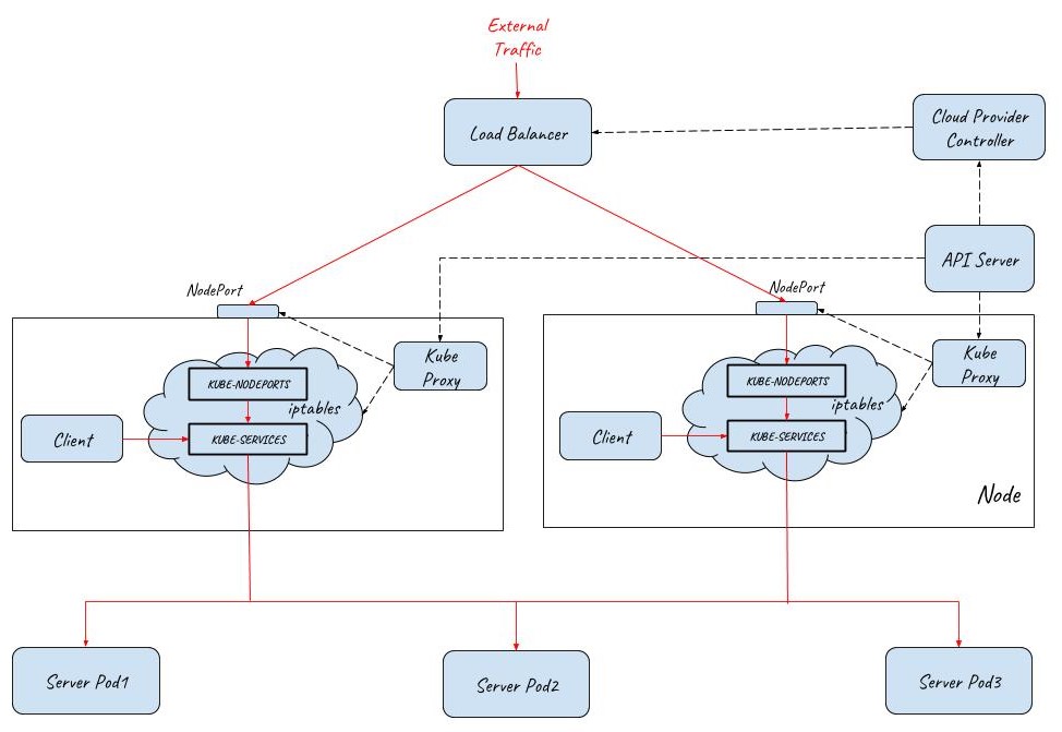Note: NodePort and LoadBalancer should also be deployed to let external traffic in, but they are not displayed in this diagram for simplicity.