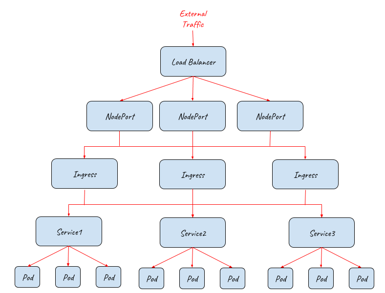 The below diagram shows how external traffic enters a Kubernetes cluster with the help of a load balancer. Two NodPorts are connected to the load balancer to allow external traffic to come in. There are three Pods in the cluster serving the client requests. The numbers of Nodeports and pods can be scaled out/in accordingly based on the working load of the system.