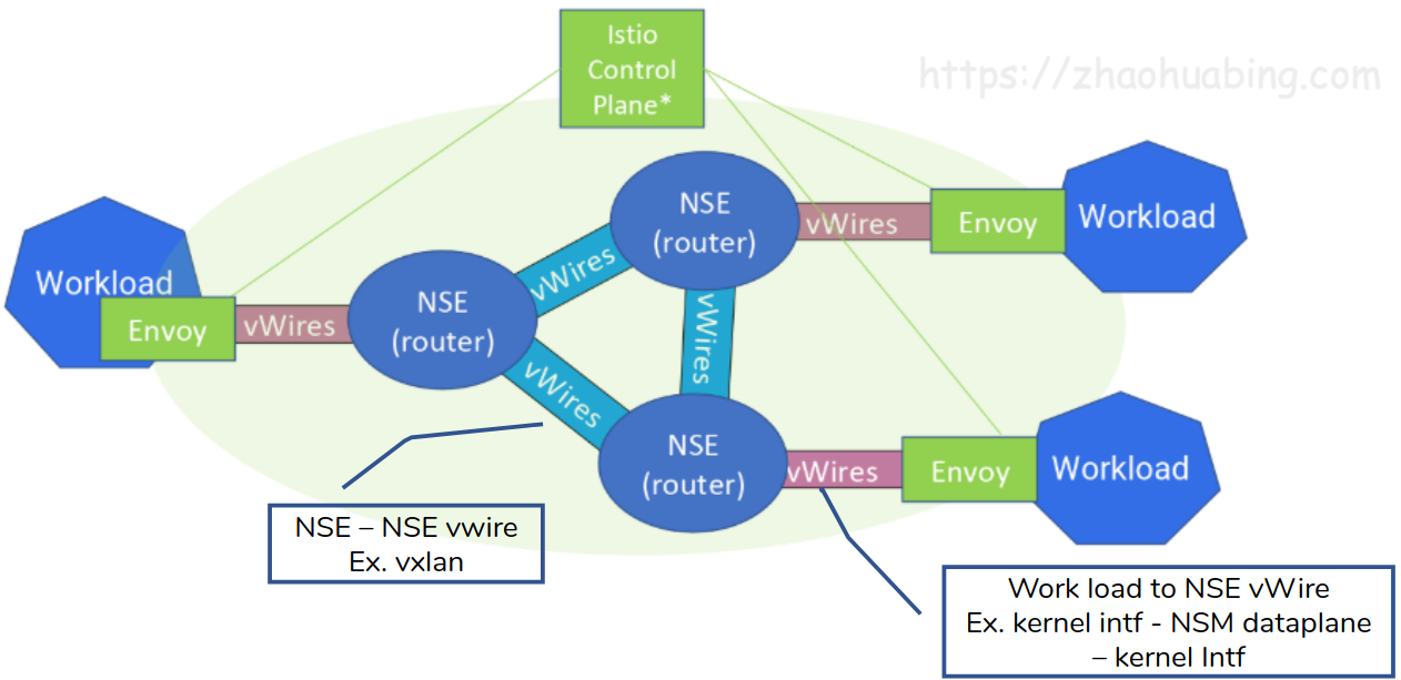 - Network Service Endpoint(NSE) :对外提供网络服务,可以是容器,POD,虚拟机或者物理设备。 NSE接收来自一个或者多个client的请求,向client提供请求的网络服务。