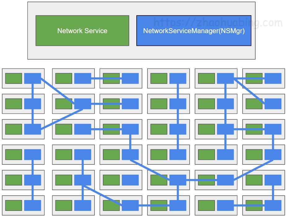 NSM会在每个Node上部署一个NSMgr,不同Node上NSMgr之间会进行通信和协商,为客户端选择符合要求的NSE,并创建客户端和NSE之间的连接。这些相互通信的NSMgr类似于Service Mesh中的Envoy Sidecar,也组成了一个连接NSE和NSC的网格,这就是Network Service Mesh这个项目名称的来源。