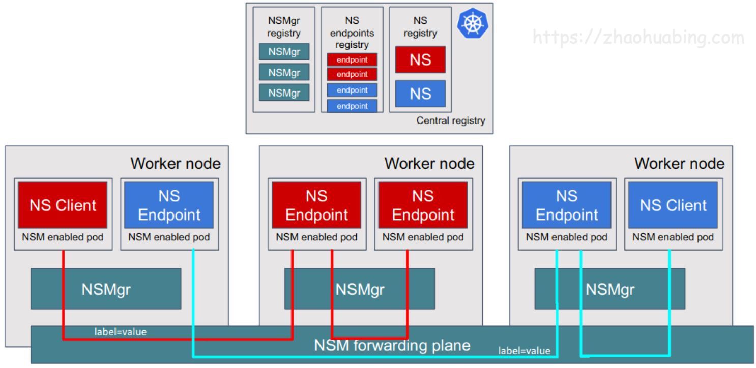 - Network Service Manager (NSMgr) :是NSM的控制组件,以daemon set形式部署在每个节点上,NSMgr之间可以相互通信,形成了一个分布式控制面。NSMgr会做两件事情: