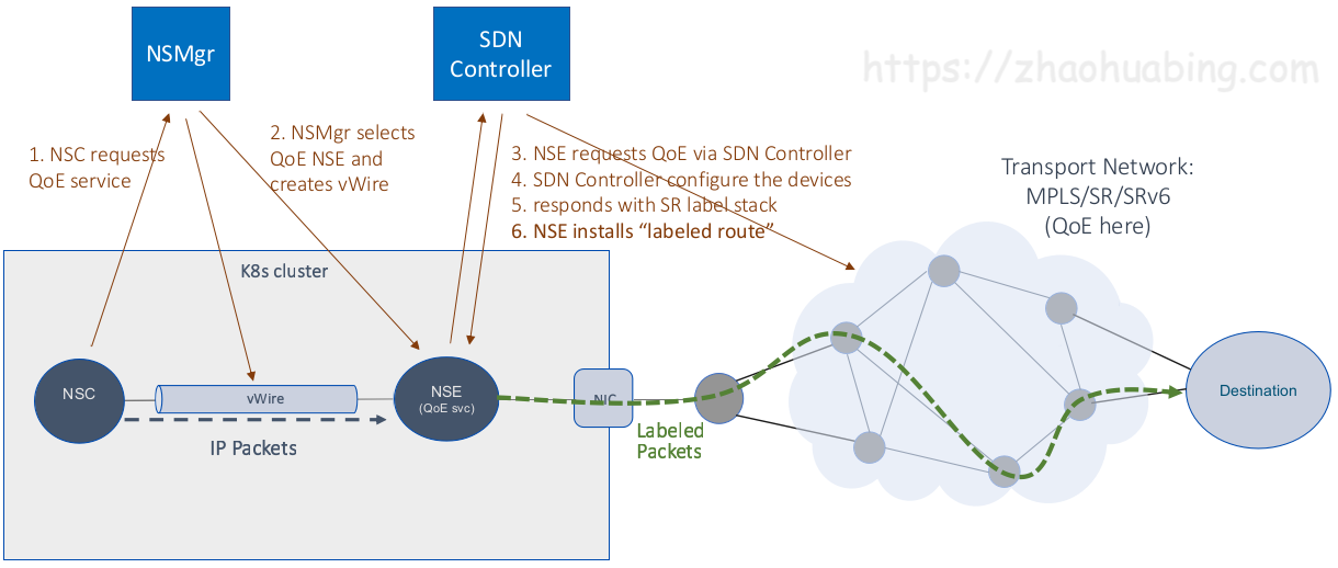 我们可以将NSM和SDN结合使用,可以通过NSM中的Network Service接入SDN提供的强大的网络服务。下图是在NSM中利用SDN为应用提供QoE(Quality of Experience)服务的一个例子。