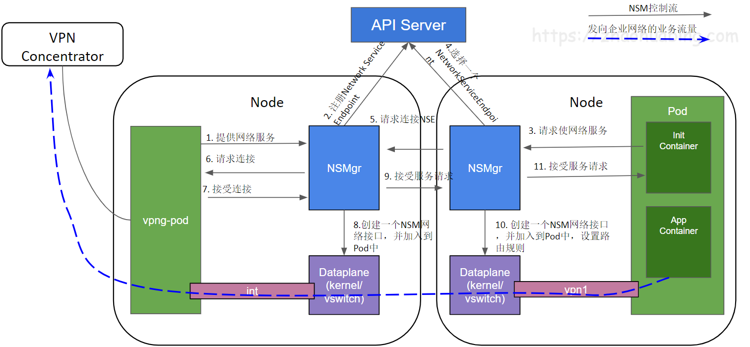 - NSMgr将vpng-pod作为NSE注册到API Server(Service Registry)中。