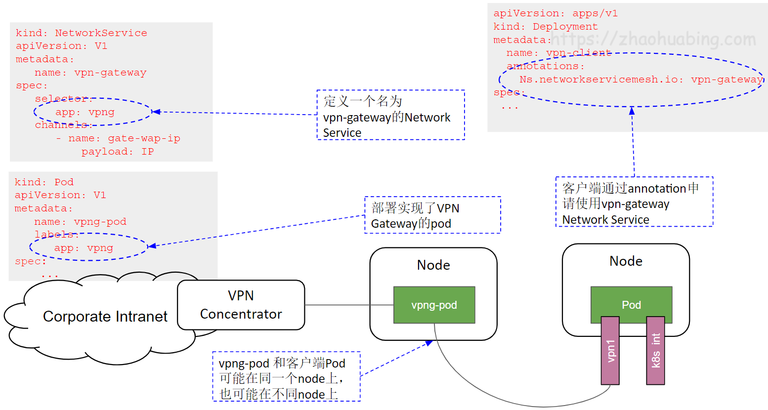 客户端通过Ns.networkservicemesh.io注解声明需要使用vpn-gateway网络服务。