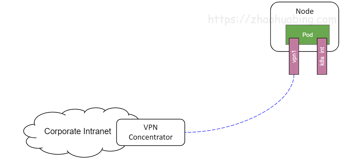 下面我们通过一个例子来说明NSM的运行机制。设想这样一个场景,用户需要将Pod中的应用中通过VPN连接到公司内网上,以访问公司内网上的服务。