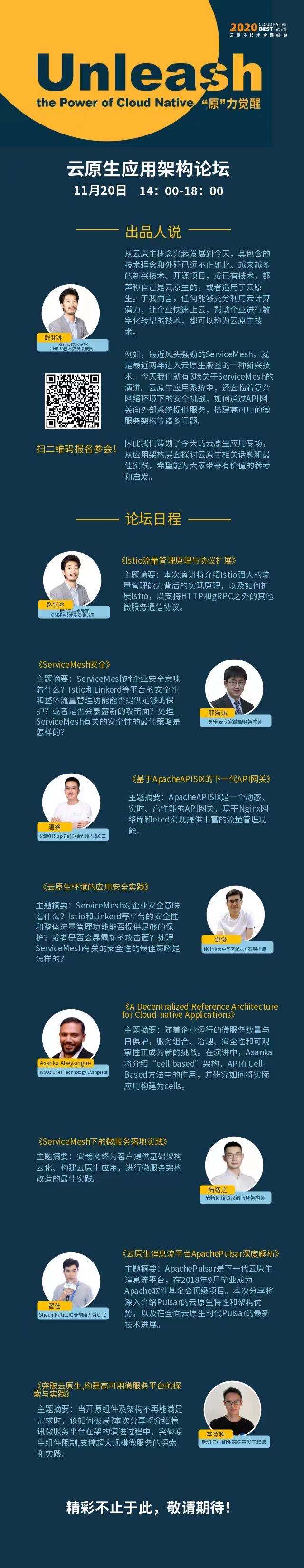 我在本专场中也会有一个『Istio 流量管理原理与协议扩展』的分享,时间11月20日下午两点,欢迎大家到时参加。
