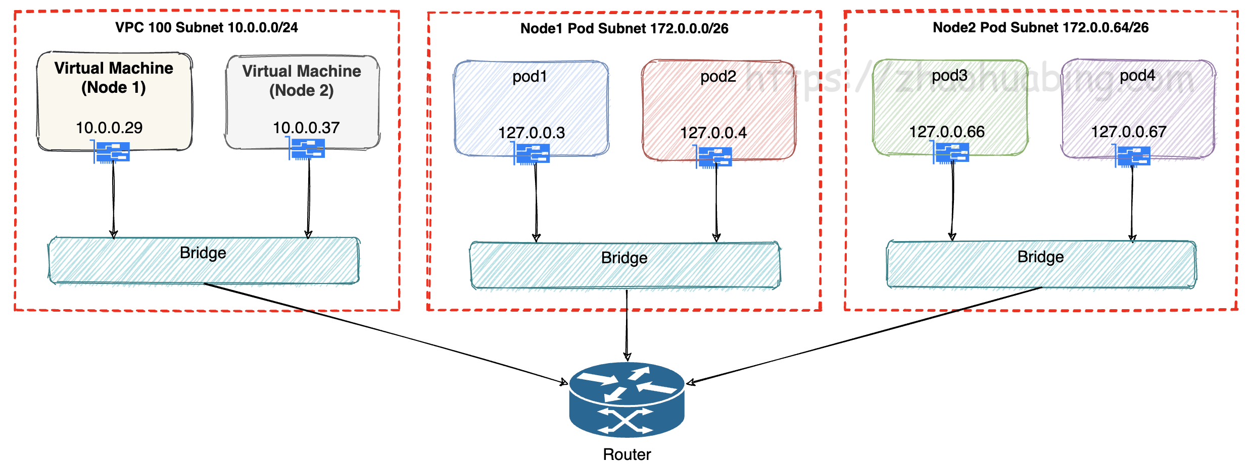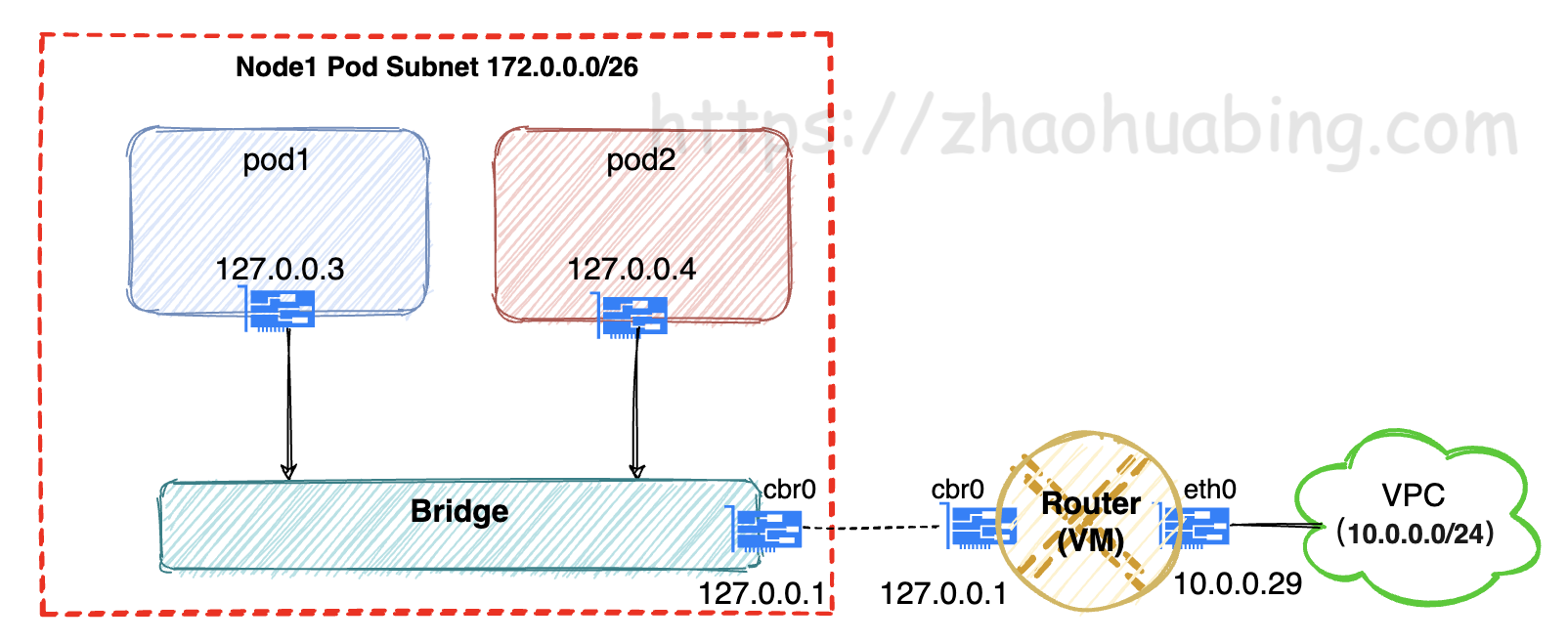 如下图所示,我们可以认为 172.0.0.1 这张网卡同时工作在网桥 cbr0 和一个连接了 Pod 子网 172.0.0.0/26 和 VPC 子网 10.0.0.0/24 的三层路由器上(虚拟机 Node1 开通了 IP forward,自身就相当于一个路由器)。