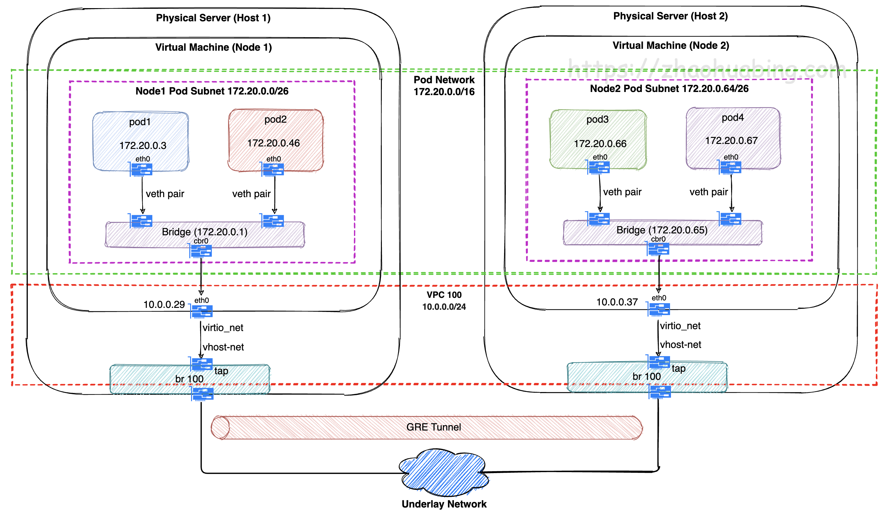 虚拟机 Node1 上所有 Pod 属于同一个 IP 子网 172.20.0.0/26,这些 Pod 都连接到了虚拟网桥 cbr0 上。如上面路由表的第二条路由条目所示,目地地为子网 172.20.0.0/26 的流量将通过源 Pod 的 eth0 发出去,eth0 的 Veth pair 对端网卡处于网桥上,因此网桥会收到该数据包。网桥收到数据包后,通过二层转发将该数据包从网桥上连接到目的 Pod 的端口发送出去,数据将到达该端的 Veth pair 对端,即该数据包的目的 Pod 上。