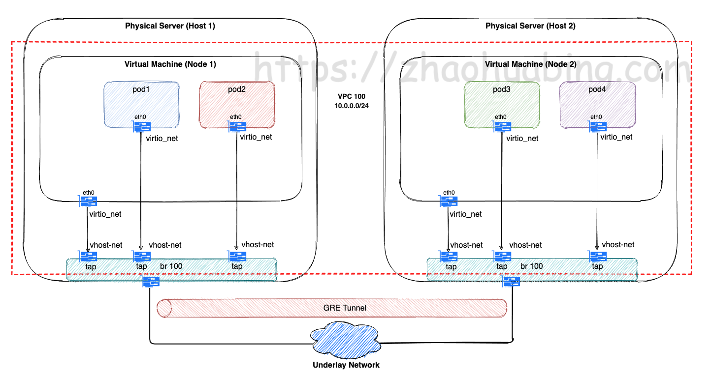 对端物理机 host2 上收到 host1 发出的数据包后,首先进行 GRE 解包,解包后得到该数据包的原始目的地址为 172.20.0.66。host2 上应该有一条路由规则,该路由规则将 Node2 的 IP 地址 10.0.0.37 作为 Pod 子网 172.20.0.64⁄26 的下一跳。根据这条路由规则,物理机将该数据包写入 Node2 对应的 Tap 设备上,通过 vhost-net/virtio-net 发送到虚拟机上的 eth0 上。
