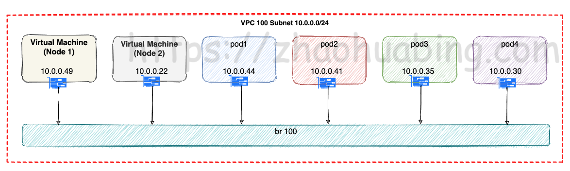 从上面的分析可以看到,虚拟机中有一个网桥,同一个虚拟机上的所有 Pod 通过 Veth pair 连到该网桥上,Pod 中的出向流量通过 Veth pair 到达了虚拟机中的网桥上。