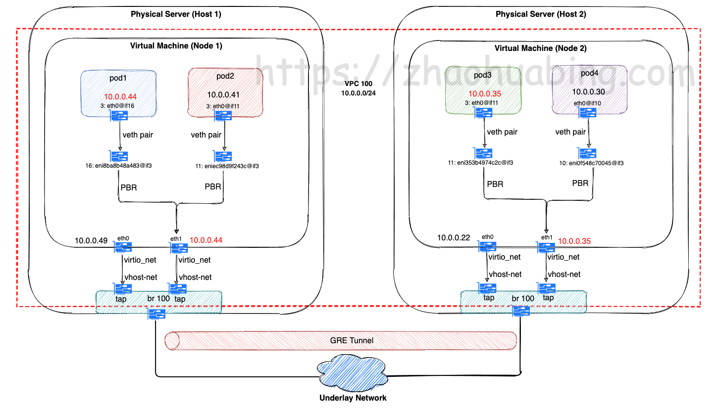 由于 Veth pair 连接了 Pod network namespace 和虚拟机的 root network namespace,因此当 Pod 通过其 eth0 发送数据包时,虚机上就可以从 Veth pair 对端的网卡上收到该数据包。