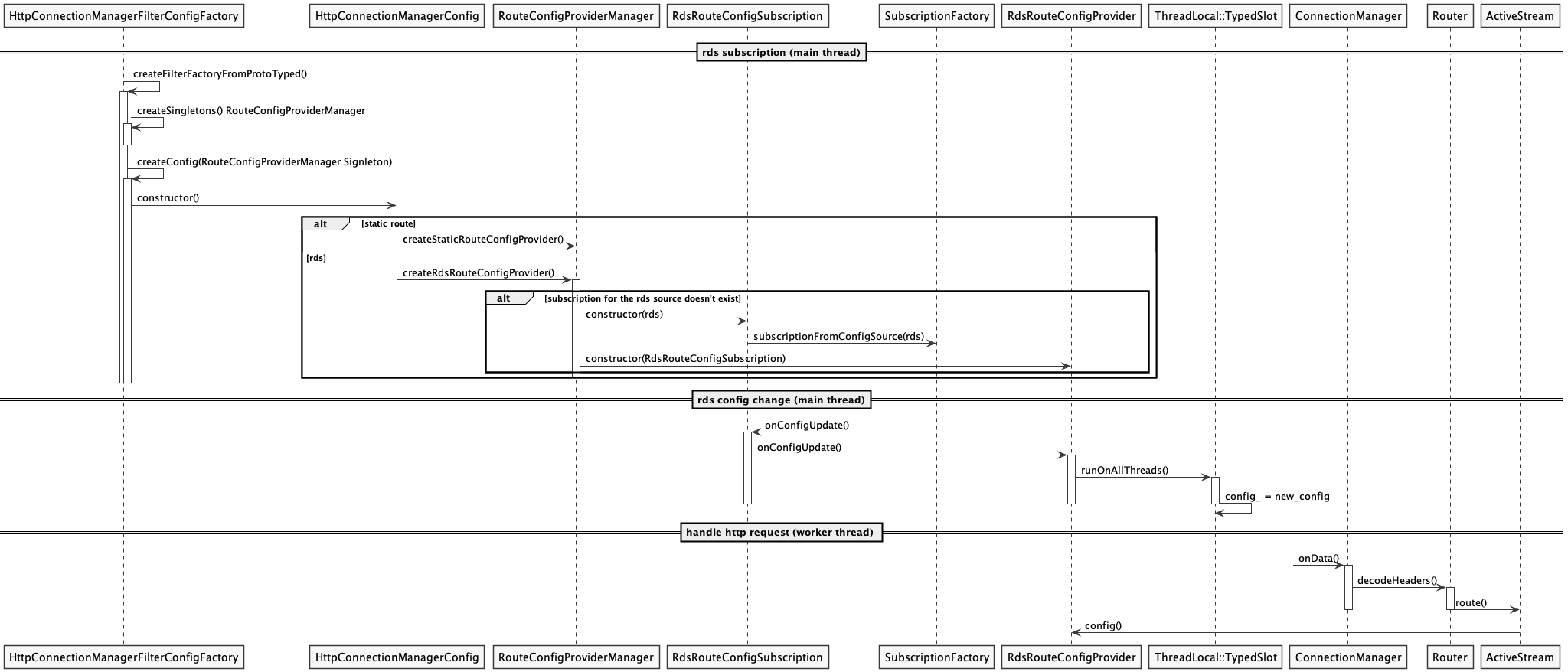 RDS(路由发现服务)的代码包括下面三个主要的流程: * 订阅 RDS * 执行线程:Main Thread * 工作流程:RDS 订阅是在 HCM 配置工厂类中处理的,详细流程如下: 1. Envoy 在初始化 Network Filter Chain 时调用 HttpConnectionManagerFilterConfigFactory 的 createFilterFactoryFromProtoTyped 方法。 1. 该方法中会创建一个 RouteConfigProviderManager 对象。代码中只会创建一个单实例,所有的 HCM 初始化过程会共用一个 RouteConfigProviderManager Singleton 对象。由于所有 HCM 初始化都是在 Main Thread 中进行的,因此对该 Singleton 的访问不会存在并发冲突。(相关代码) 1. 根据 HCM 的路由配置是 RDS 还是静态配置,分别创建 RdsRouteConfigProvider 或者 StaticRouteConfigProvider (相关代码)。该方法中会创建一个 RdsRouteConfigSubscription 对象,该对象负责具体的订阅逻辑,然后再以 RdsRouteConfigSubscription 作为参数来创建 RdsRouteConfigSubscription。注意这里 RdsRouteConfigProvider 实例是和 RDS 配置的 hash 值一一对应的,同样的 RDS 配置(即 config_source 和 route_config_name 相同),只会创建一个 RdsRouteConfigProvider,以避免多个 HCM 重复订阅相同的 RDS。如果一个 RDS 配置对应的 RdsRouteConfigProvider 已经存在,会将已有的 RdsRouteConfigProvider 返回给 HCM 。即多个 HCM 配置的 RDS 相同的话,会共用一个 RdsRouteConfigProvider 实例。 (相关代码)。 1. 在 RdsRouteConfigSubscription 的构造方法中,会从 context 中拿到 ClusterManager 的SubscriptionFactory,然后通过 subscriptionFromConfigSource 方法对该 RDS 进行订阅。 subscriptionFromConfigSource 方法中会将自身作为SubscriptionCallbacks 参数,以接收 RDS 更新通知。(相关代码) * 处理 RDS 的配置更新 * 执行线程:Main Thread * 工作流程: 1. RdsRouteConfigSubscription 的 onConfigUpdate 方法收到 RDS 配置更新的回调,然后调用 RdsRouteConfigProvider 的 onConfigUpdate 方法。(相关代码) 2. RdsRouteConfigProvider 通过 Thread local storage 机制将配置更新到各个 worker thread 中。 * 使用 RDS 配置对请求进行路由 * 执行线程:Worker Thread * 工作流程: 1. Envoy 调用到 Network Filter Chain 中的 HCM filter。 1. HCM filter 调用到 HTTP Filter Chain 中的 Router。 2. Router 拿到缓存的 RDS 配置,根据 RDS 配置进行路由。