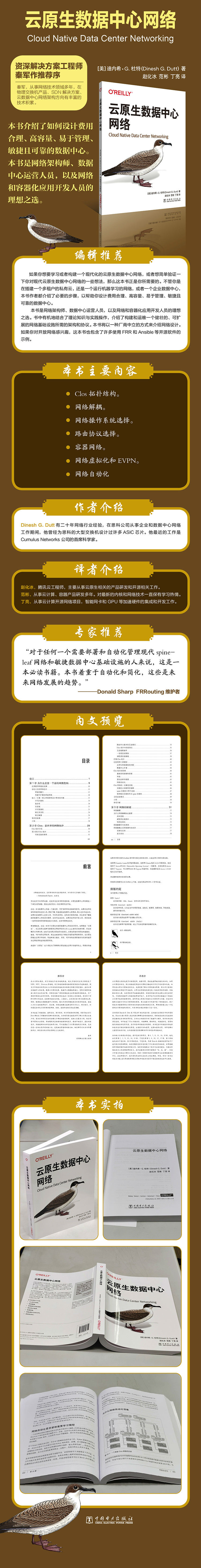 如果你想要学习或者构建一个现代化的云原生数据中心网络,或者想简单验证一下你对现代云原生数据中心网络的一些想法,那么这本书正是你所需要的。不管你是在搭建一个多租户的私有云,还是一个运行机器学习的网络,或者一个企业数据中心,本书作者都介绍了必要的步骤,以帮助你设计费用合理、高容量、易于管理、敏捷且可靠的数据中心。