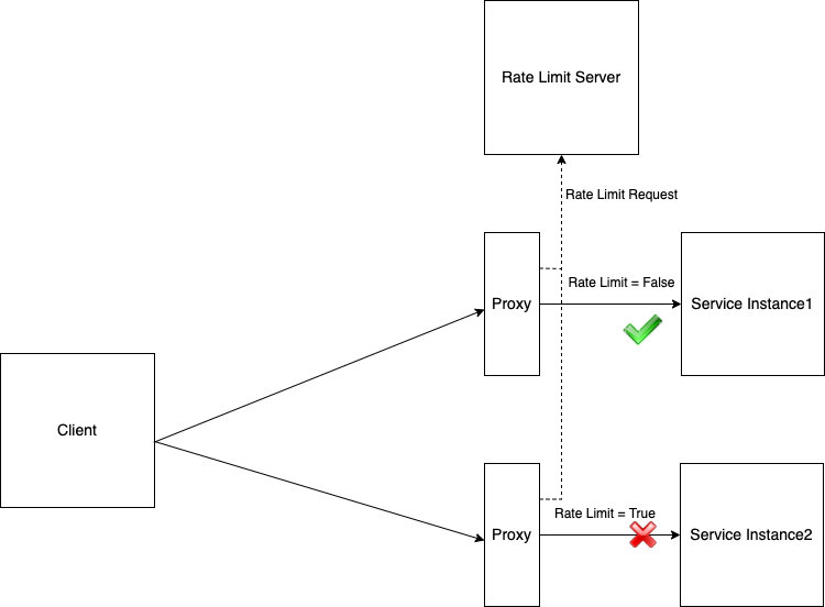 和本地限流不同的是,在使用全局限流时,所有的服务实例共用一个限流配额。全局限流通过一个限流服务器来实现在多个服务实例之间共享限流配额。在收到请求时,服务服务端的 Sidecar Proxy 会先向限流服务器发送一个限流查询请求,限流服务器在其自身的配置文件中读取限流的规则,根据规则判断一个限流请求是否触发了限流条件,然后将限流结果返回给 Sidecar Proxy。 Sidecar Proxy 根据该限流结果决定是禁止本次请求还是继续处理本次请求。