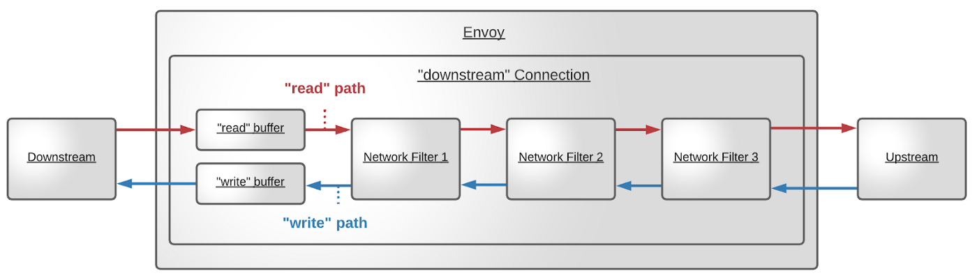 Envoy 将从 Downstream 套接字中读取到的数据放到 buffer 中,传递给 Network Filter chain 进行处理,由 Network Filter chain 处理后,一般会由 chain 中最后一个 filter 发送给 Upstream。